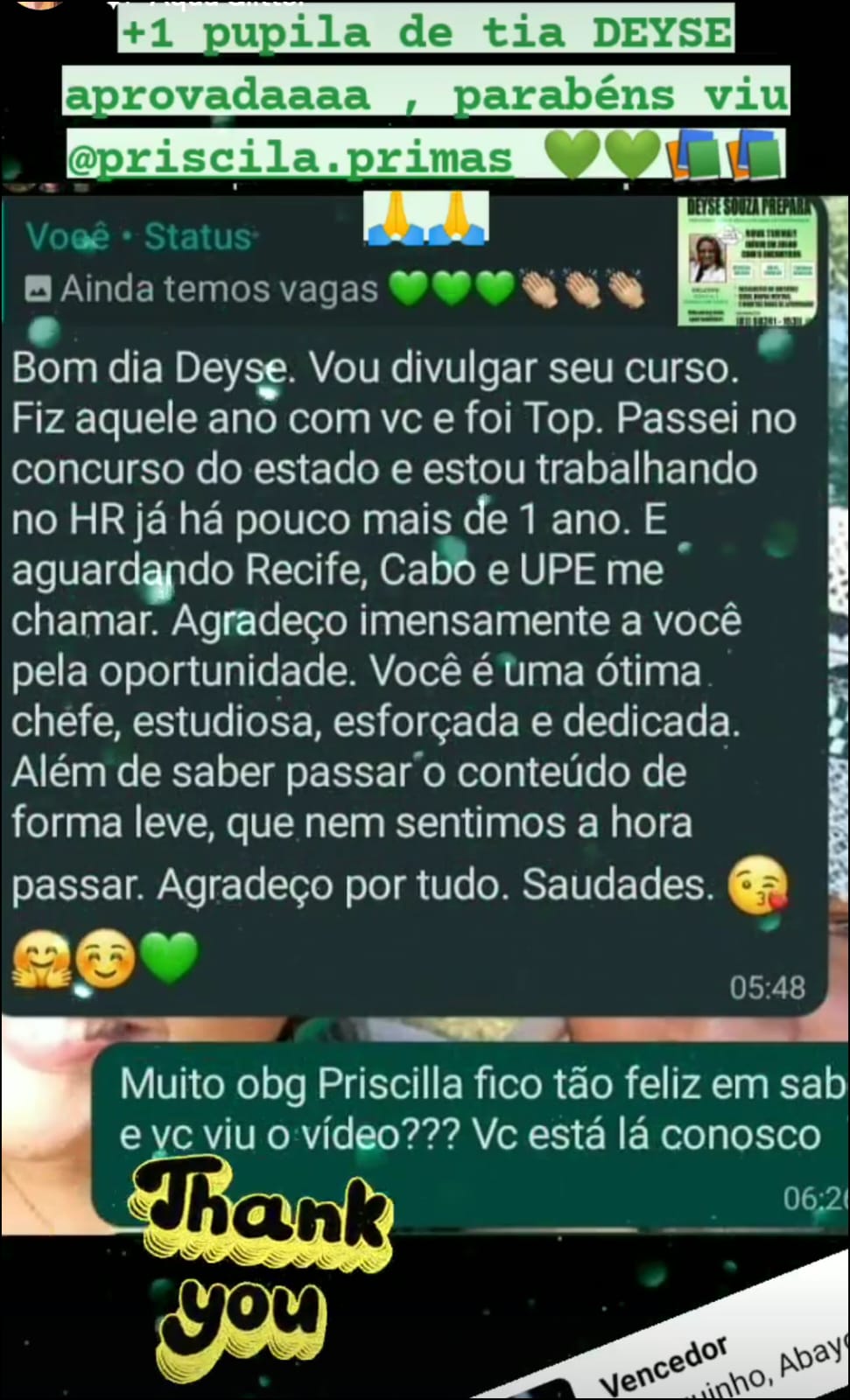 É UMA REALIZAÇÃO PARA AS ALUNAS E PARA MIM, É A PROVA DE QUE A PORTA QUE DEUS ABRE, EDITAL NENHUM FECHA.
